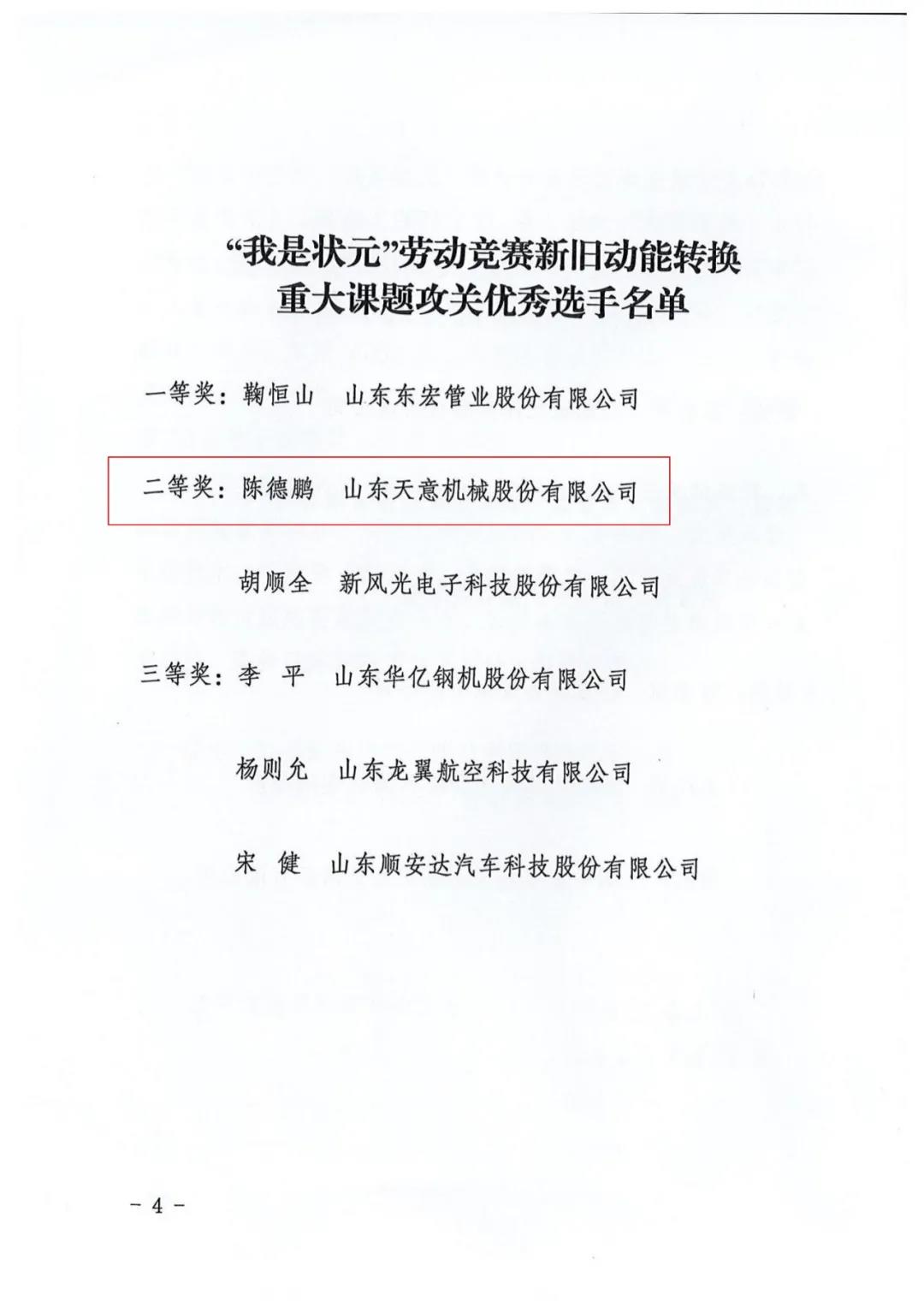 我司陳德鵬獲得濟寧市“我是狀元”勞動競賽新舊動能轉換重大課題攻關競賽單元二等獎