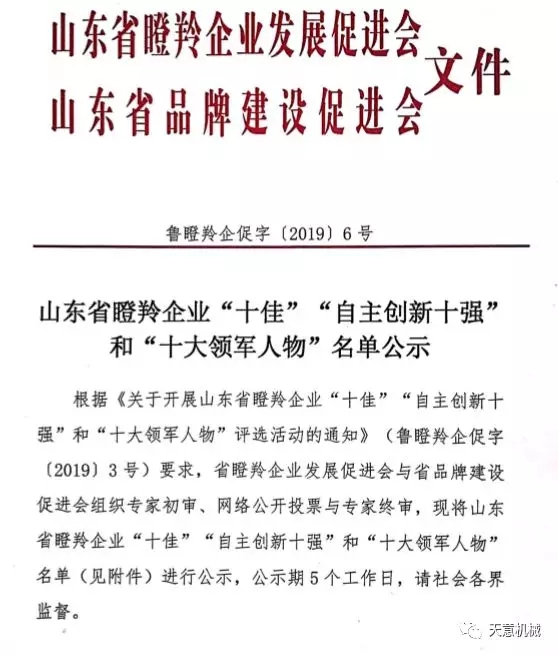 根據(jù)《關于開展山東省瞪羚企業(yè)十佳”“自主創(chuàng)新十強十大領軍人物評選活動的通知》(魯?shù)闪缙蟠僮帧?/span>20193號)要求,2019126日,山東省瞪羚企業(yè)發(fā)展促進會、山東省品牌建設促進會發(fā)布魯?shù)闪缙蟠僮?/span>[2019]6號文,公布經(jīng)過專家初審、網(wǎng)絡公開投票與專家終審,評選出了山東省瞪羚企業(yè)十佳、自主創(chuàng)新十強十大領軍人物。天意機械榮獲“山東省十佳瞪羚企業(yè)”稱號。